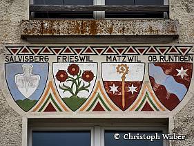 Wappen der Dorfschaften Salvisberg, Matzwil, Frieswil, Oberruntigen ueber dem Eingang des Schulhauses Matzwil 1925