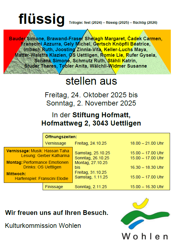 Die alljährliche Ausstellung der Kulturkommission findet dieses Jahr vom Freitag, 24.10.2025 bis Sonntag, 02.11.2025 zum Thema "flüssig" statt.