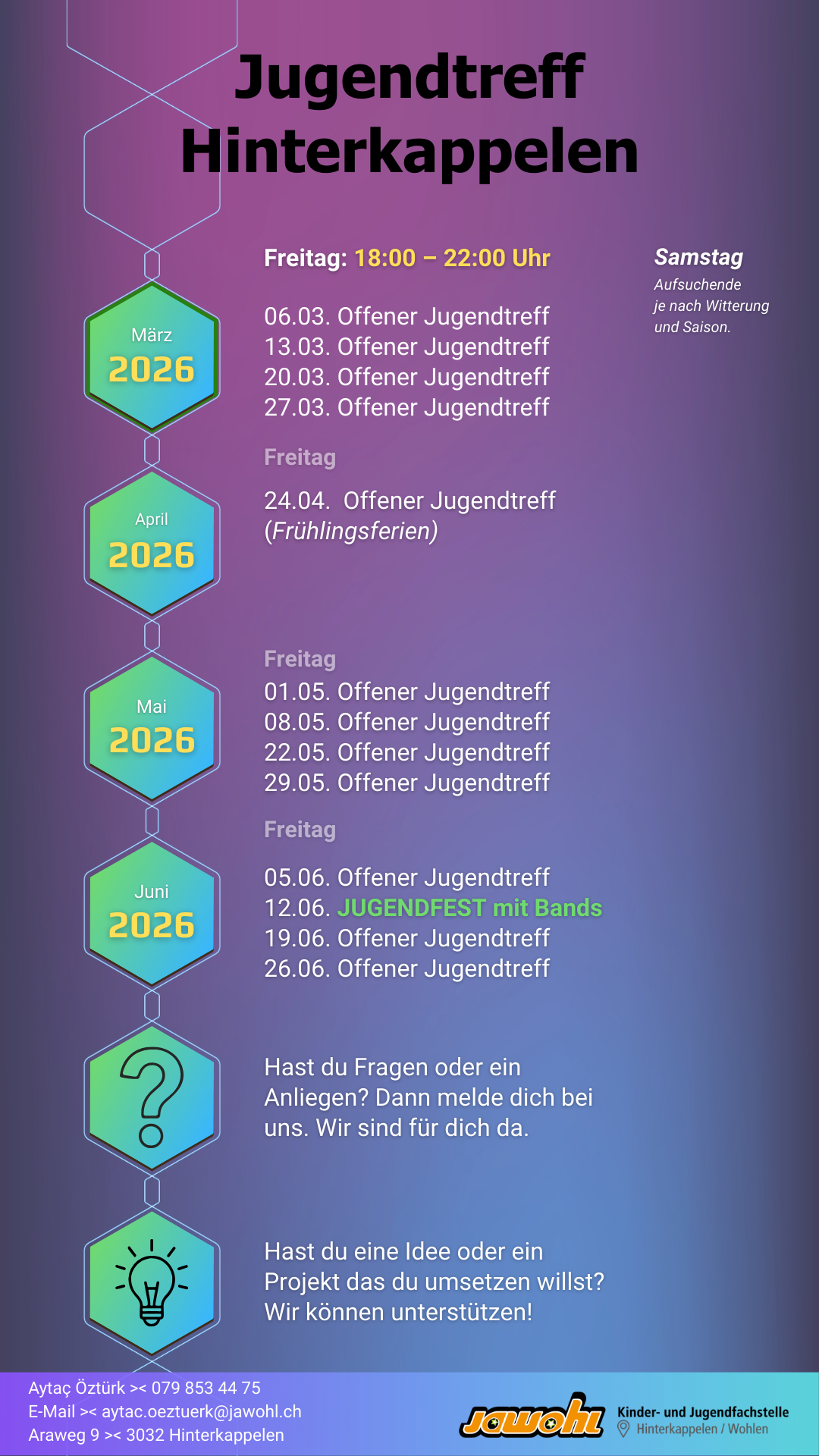 Beachte die Öffnungszeiten! Der Jugendtreff am Freitagabend findet abwechselnd einmal in Uettligen und einmal in Meikirch statt.