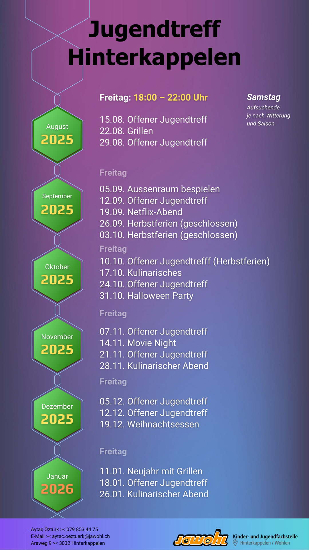 Wir haben jeden Freitagabend zwischen 18 – 22 Uhr geöffnet und bieten den Jugendlichen Raum, um sich zu treffen, auszutauschen, zu spielen und eigene Ideen umzusetzen.