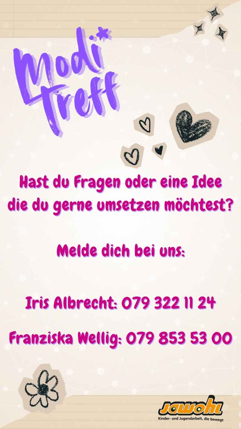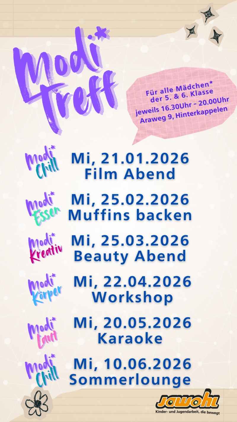 Die monatlichen Modi*abende in Hinterkappelen finden jeweils am Mittwochabend zwischen 16:30 und 20:00 Uhr statt. Wie die bisherigen Anlässe, sind auch die künftigen Modi*abende am Mittwoch für alle jungen Frauen* aus dem gesamten Einzugsgebiet offen.